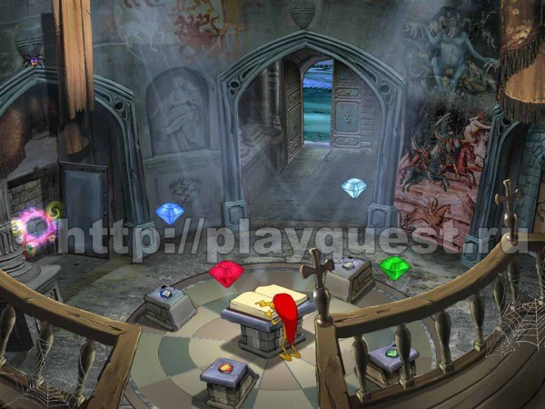 Кликаем по четырем каменным постаментам вокруг книги