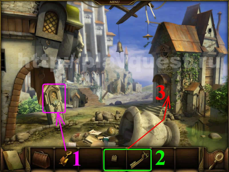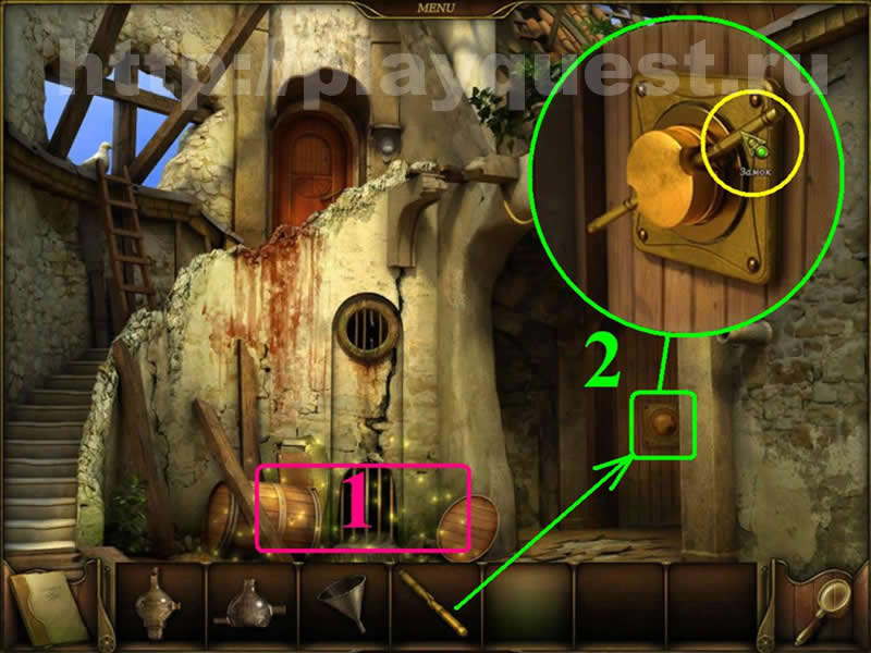 Домик прислуги1. осматриваем памятку на стене (о великой тайне и встрече с владельцем замка)