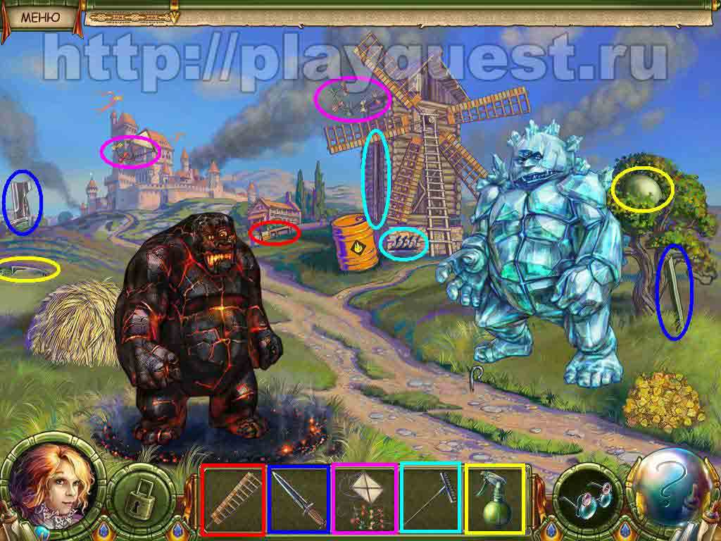 5. брызгаем керосин на огненного голема – он вырастет и подожжет воздушного змея и стог сена (за големом) – на месте стога находим последнюю часть ножа