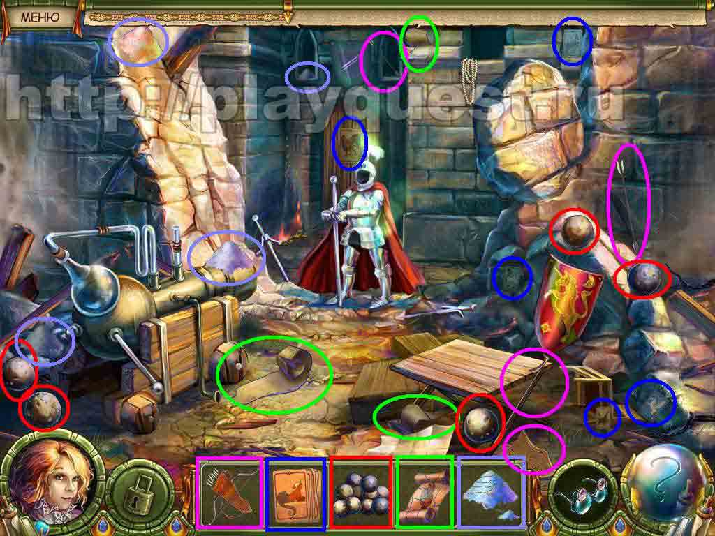 4. порох применяем на пушку, нажимаем рычаг: ядро разобьет рыцаря – на его месте находим последнюю стрелу для колчана