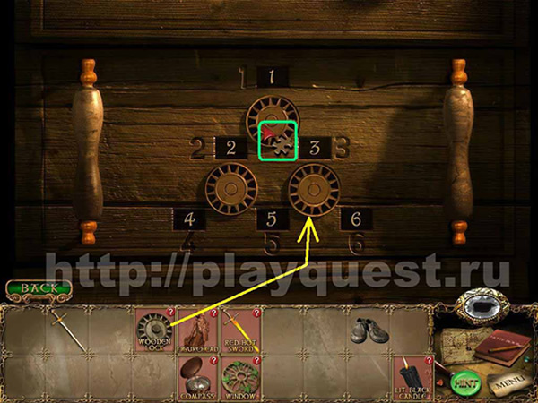 Поворачивая замки, выставляем в окошках те же числа, что и числа, «вырезанные» на дереве у каждого окошка