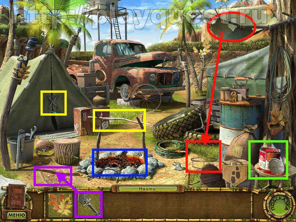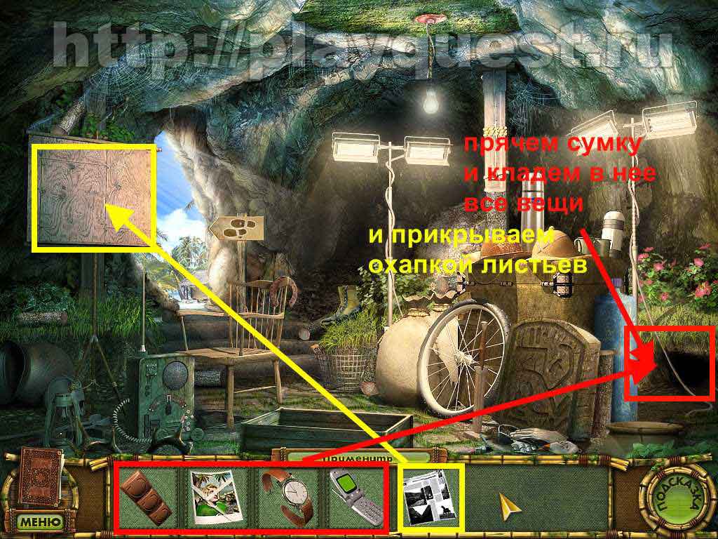 - собираем по частям шоколад, телефон (антенна лежит в деревянном ящике), фотографию, часы и газету (последний кусок лежит в деревянном ящике)