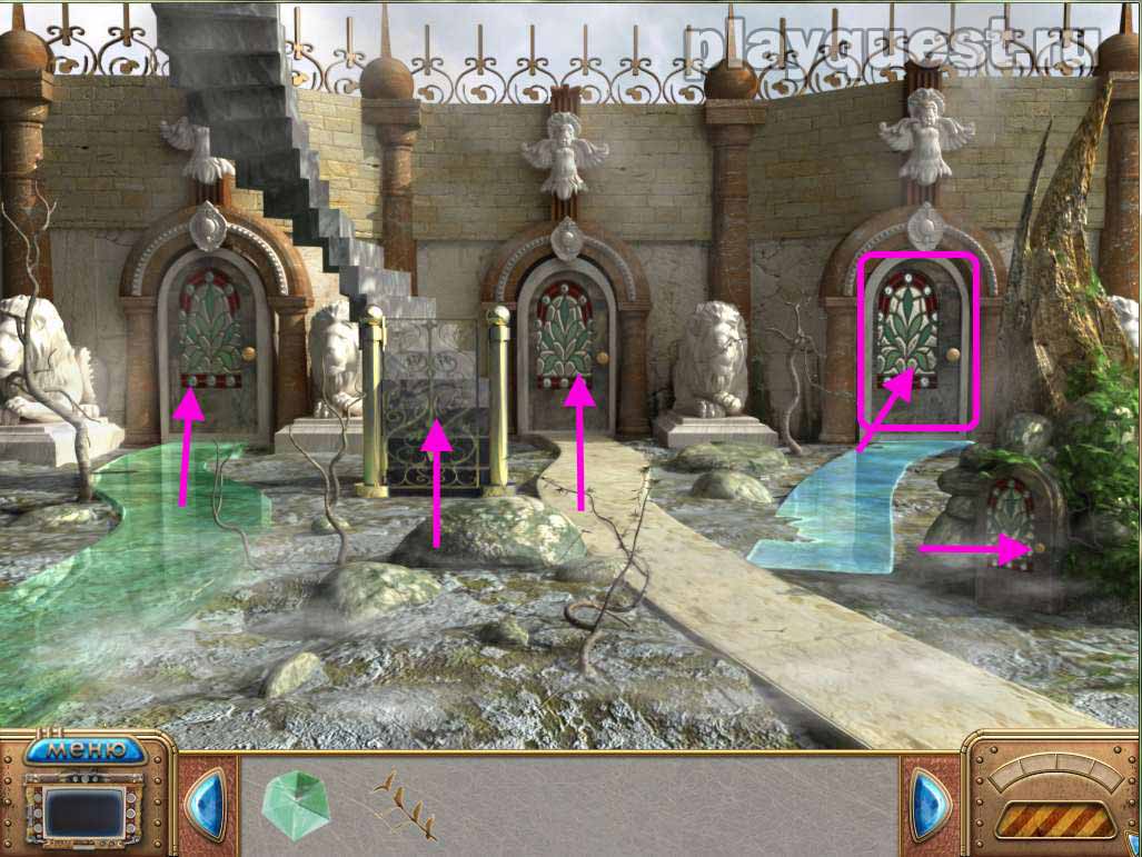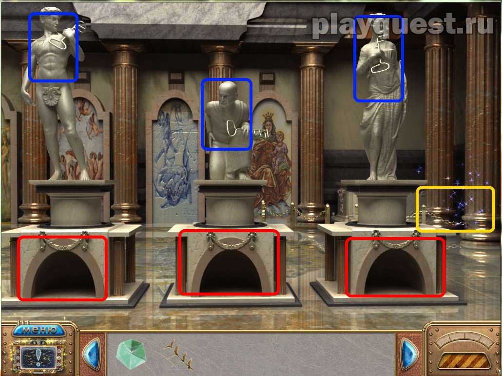 1. Разговариваем со статуями-хранителями. Первый скажет, что обменяет ключ на изумруд из барельефа