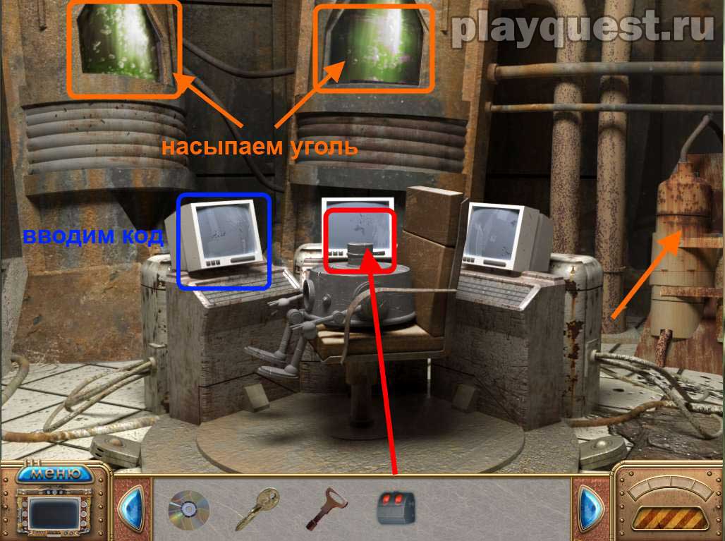 1. Смазываем робота с помощью масленки и разговариваем с ним. Теперь нам нужно найти уголь и проникнуть в главный компьютер