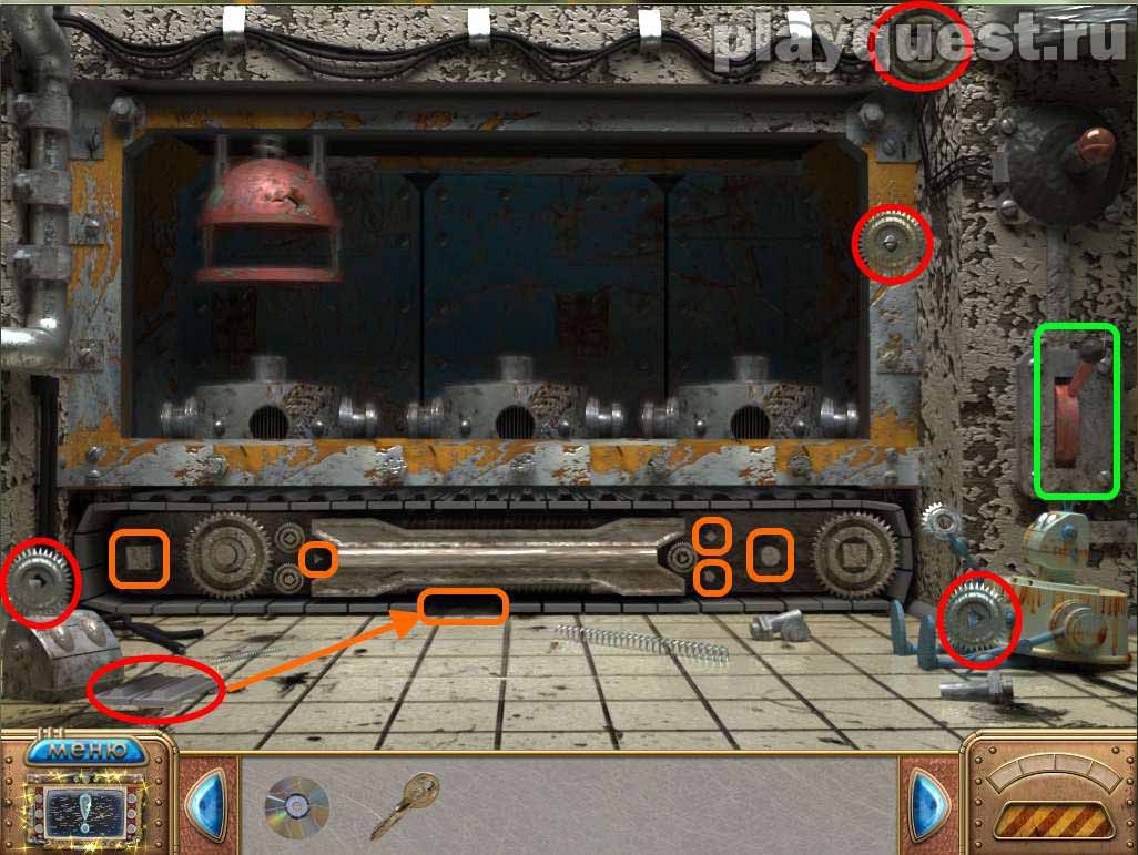2. Расставляем 4 шестеренки на свои места (обращаем внимание на отверстия внутри них). Расставляем соответственно - квадратную- на квадратный штырь, треугольную - на треугольный и т.д. Одной шестеренки не хватает, нужно будет ее найти