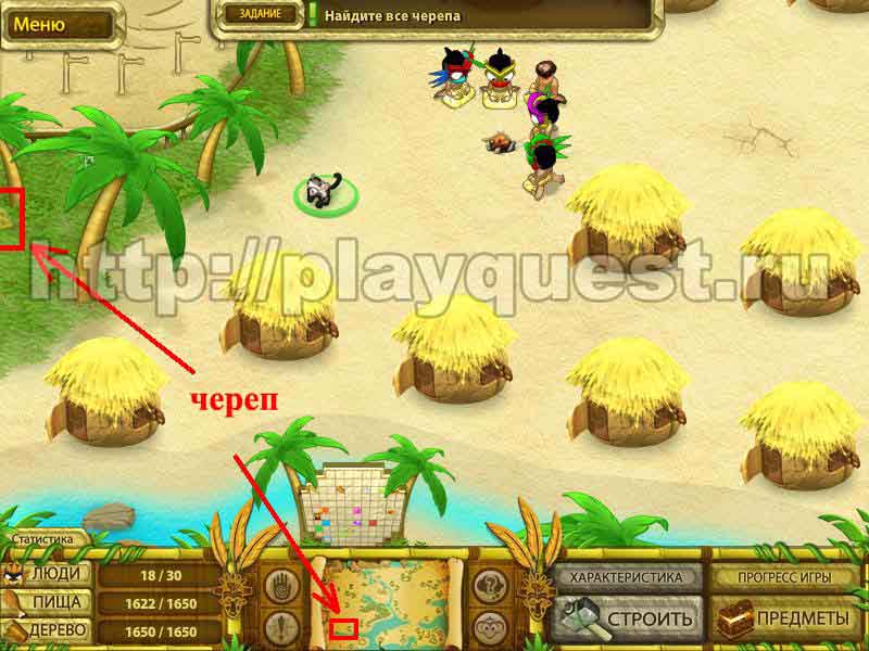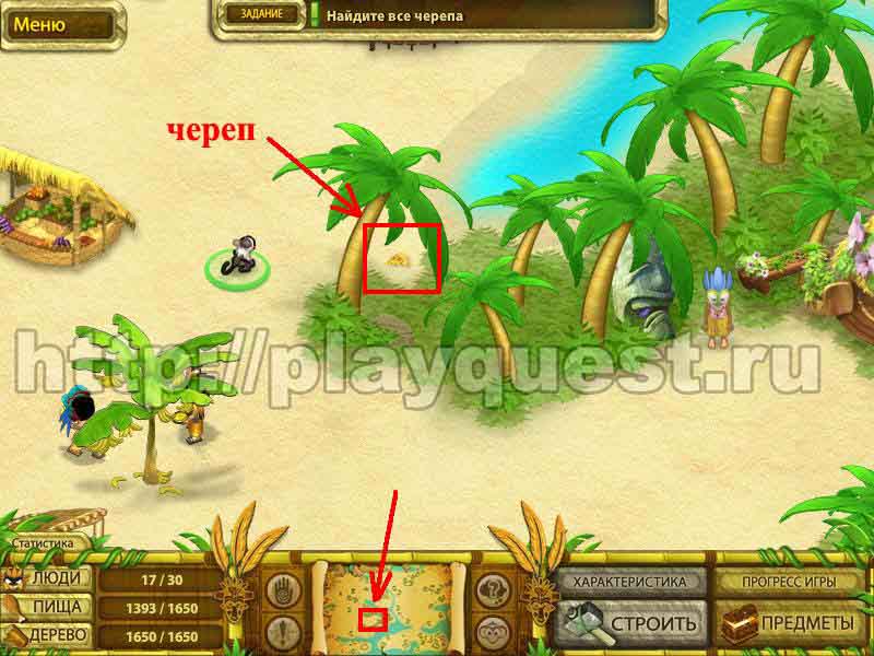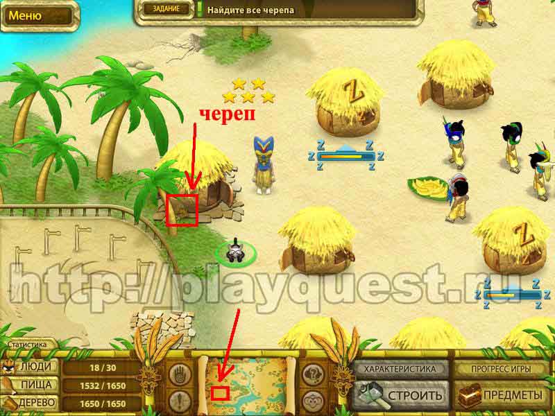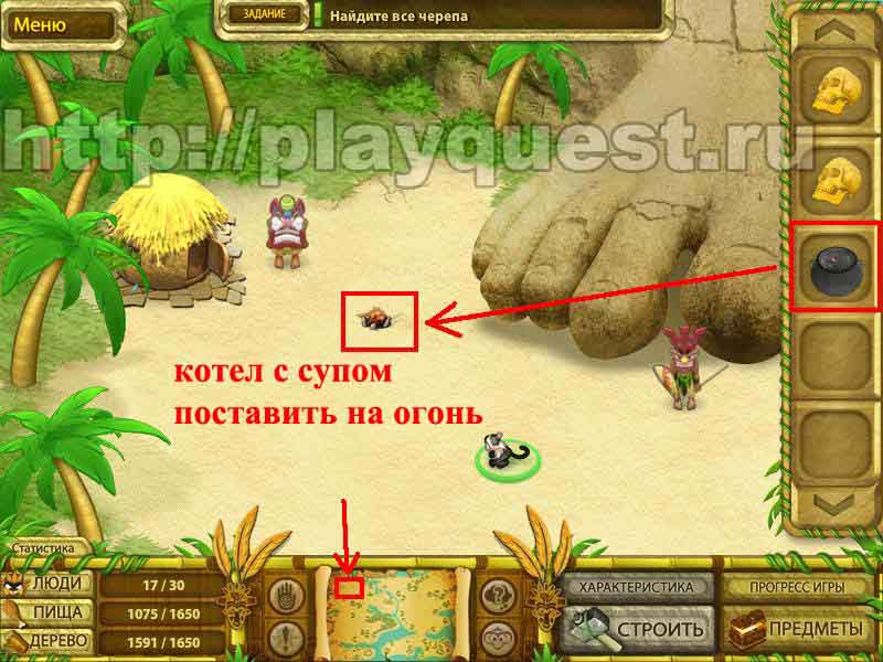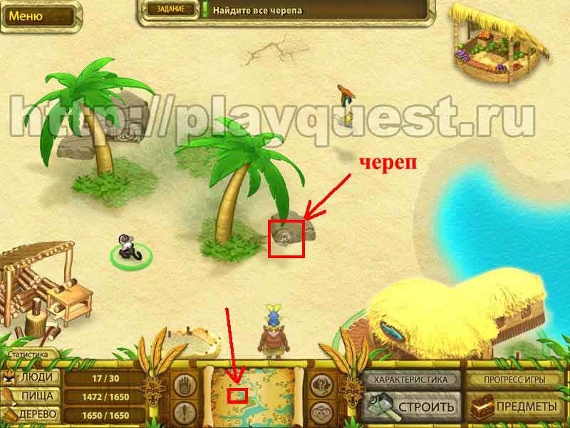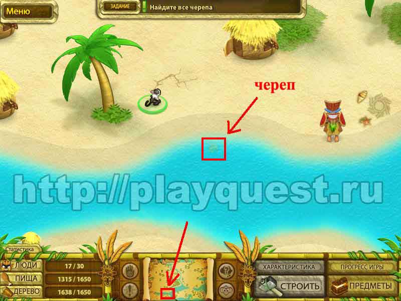 Черепа 1й - дадут после выполнения задания по строительству пятнадцати хижин 2й - после выполнения небольшого задания: берем наконечник косы, палку и соединяем в инвентаре , - получим косу. Скашиваем косой траву у пальмы. Забираем череп 3й - дадут за выполнение задания: берем у хижины котел и собираем грибы у водопада. Кладем грибы в котел в инвентаре. Получим суп, - ставим его на очаг.