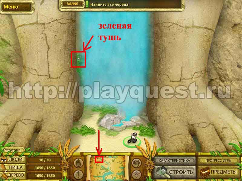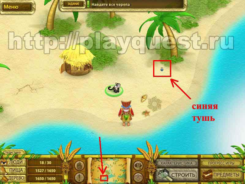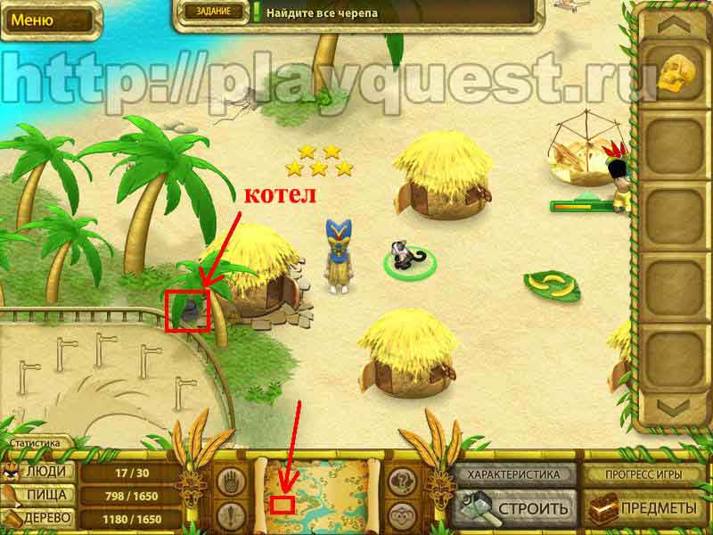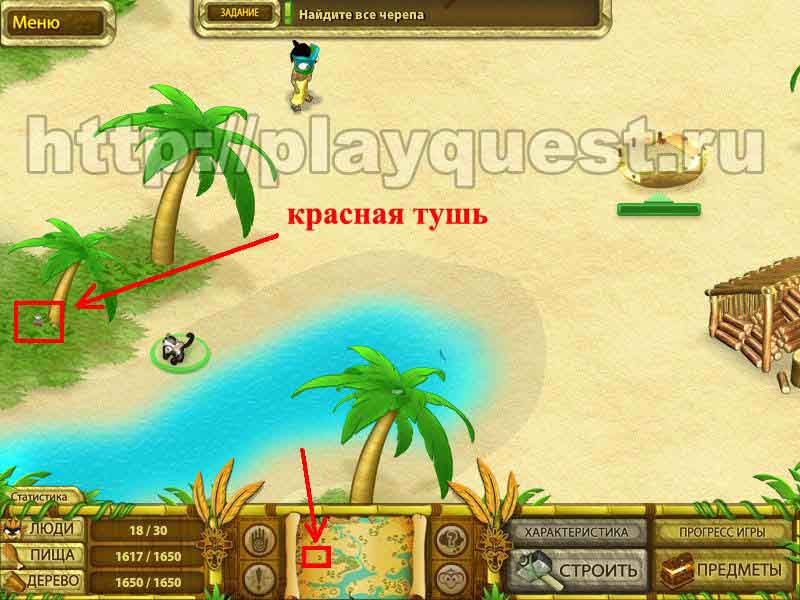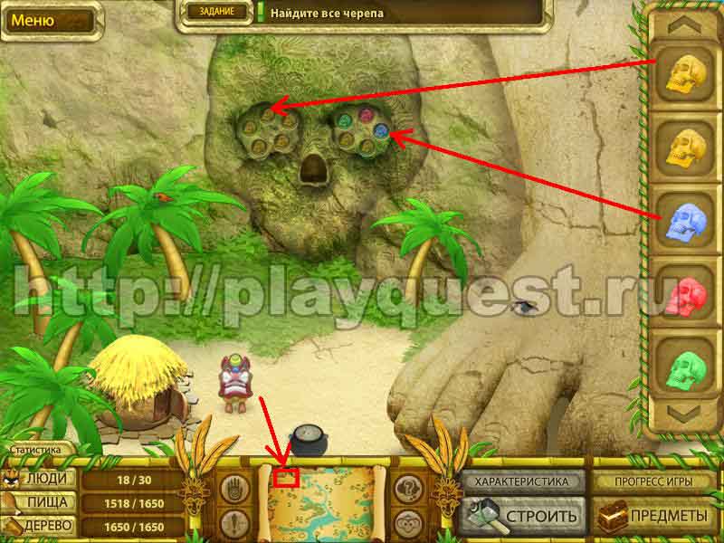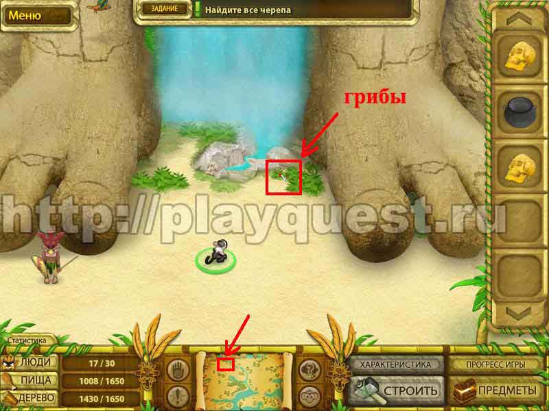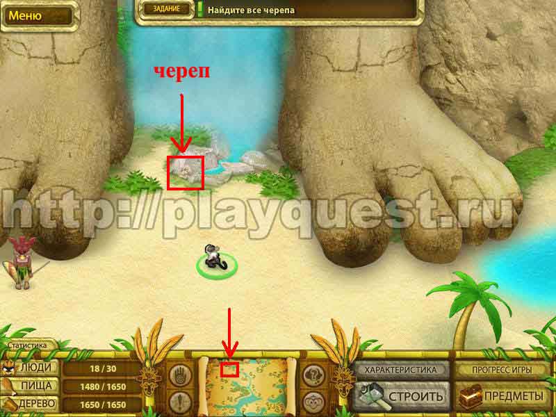 Черепа 1й - дадут после выполнения задания по строительству пятнадцати хижин 2й - после выполнения небольшого задания: берем наконечник косы, палку и соединяем в инвентаре , - получим косу. Скашиваем косой траву у пальмы. Забираем череп 3й - дадут за выполнение задания: берем у хижины котел и собираем грибы у водопада. Кладем грибы в котел в инвентаре. Получим суп, - ставим его на очаг.