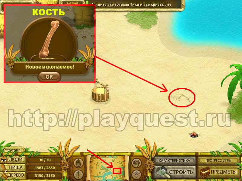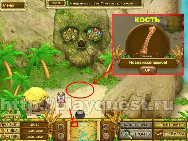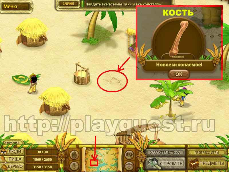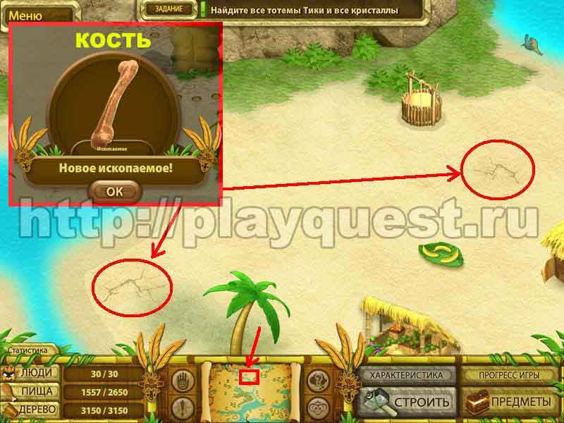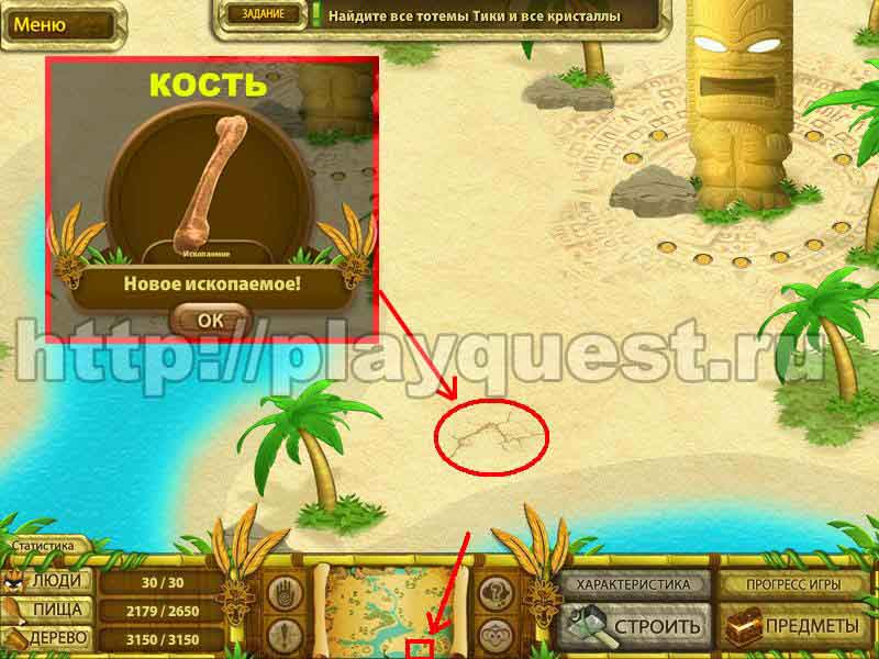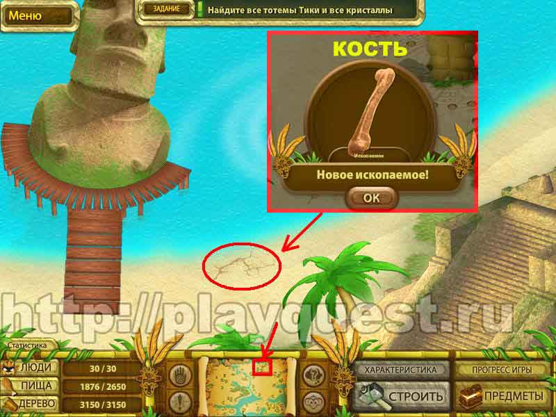 Ископаемые лежат под трещинами в земле. Копаем в них лопатой с помощью любого поселенеца. Всего 20 костей. После выполнения задания получим статую Тики