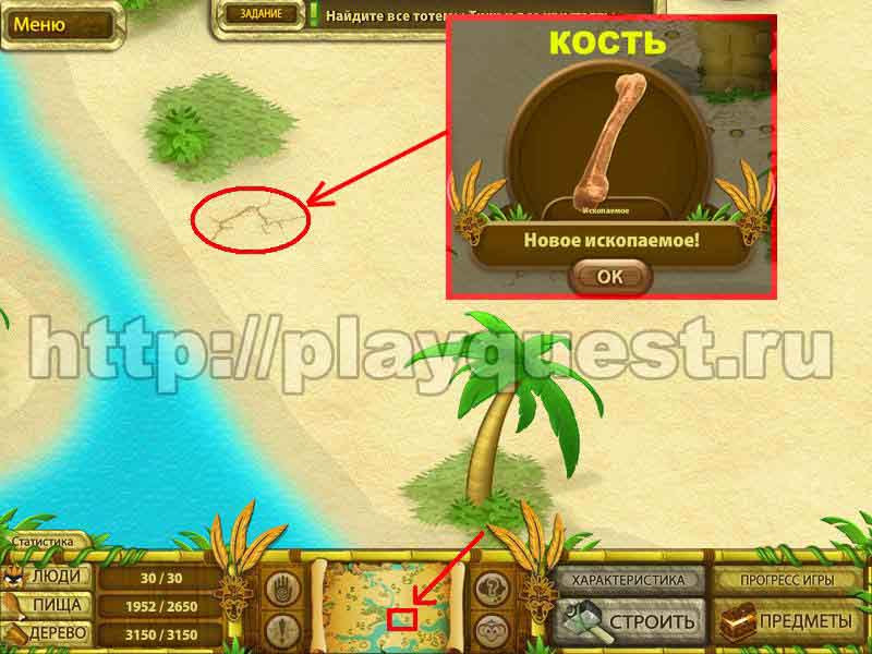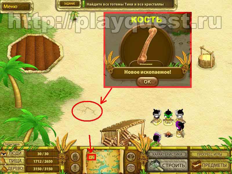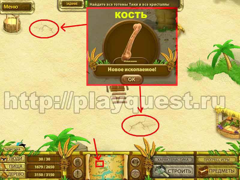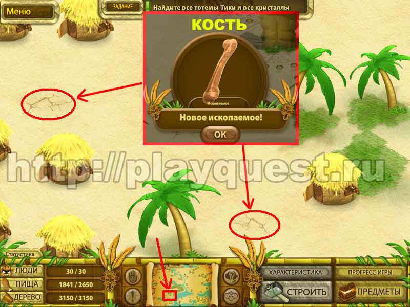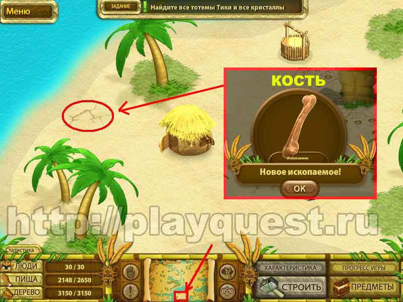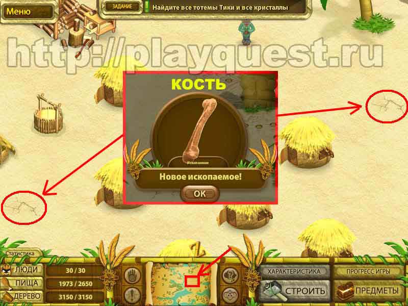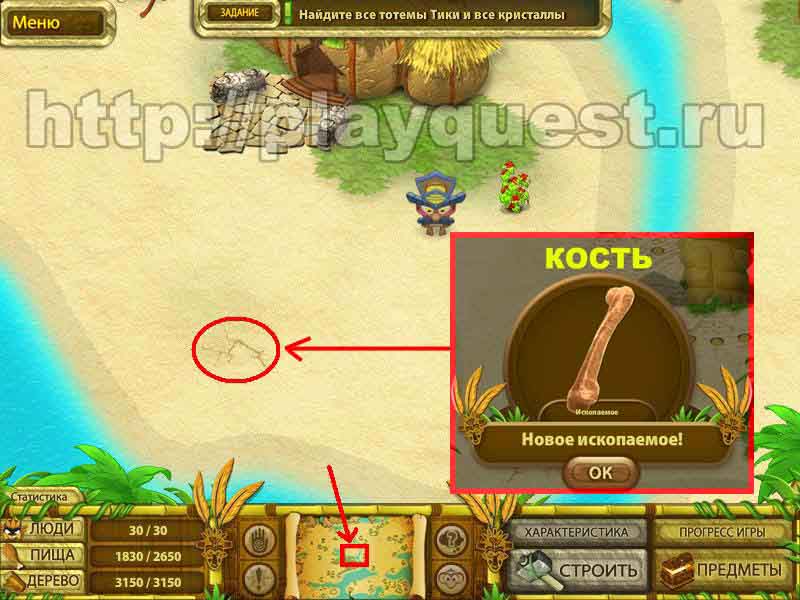 Ископаемые лежат под трещинами в земле. Копаем в них лопатой с помощью любого поселенеца. Всего 20 костей. После выполнения задания получим статую Тики