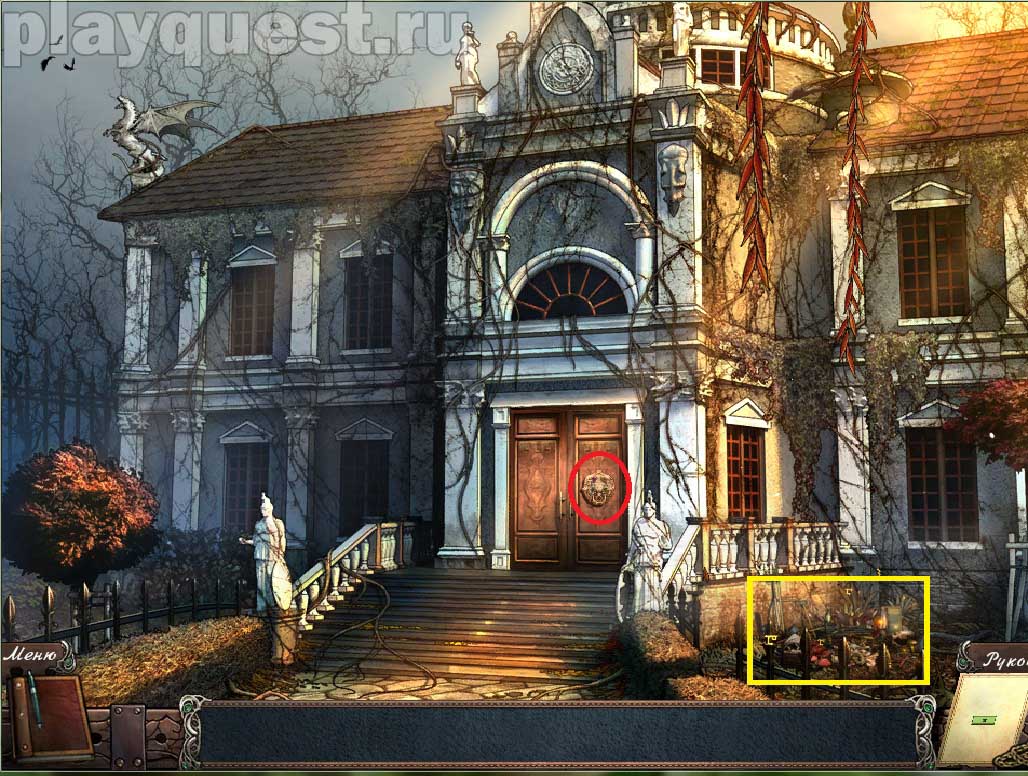 2. Прежде всего осмотрим предметы справа от крыльца: выполняем задание по поиску предметов. Если возникнут сложности, можно воспользоваться подсказкой - медальоном (правый нижний угол). В результате мы получим 5 фигурок животных: лев, ящерица, лягушка, змея и ворон.