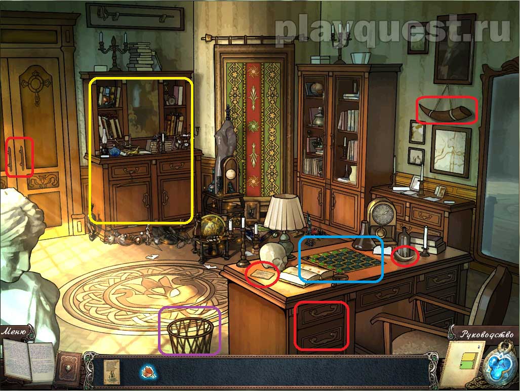 1. Изучаем ящик письменного стола: открываем его ключом. Передвигаем предметы, пока не найдем 5 пластин
