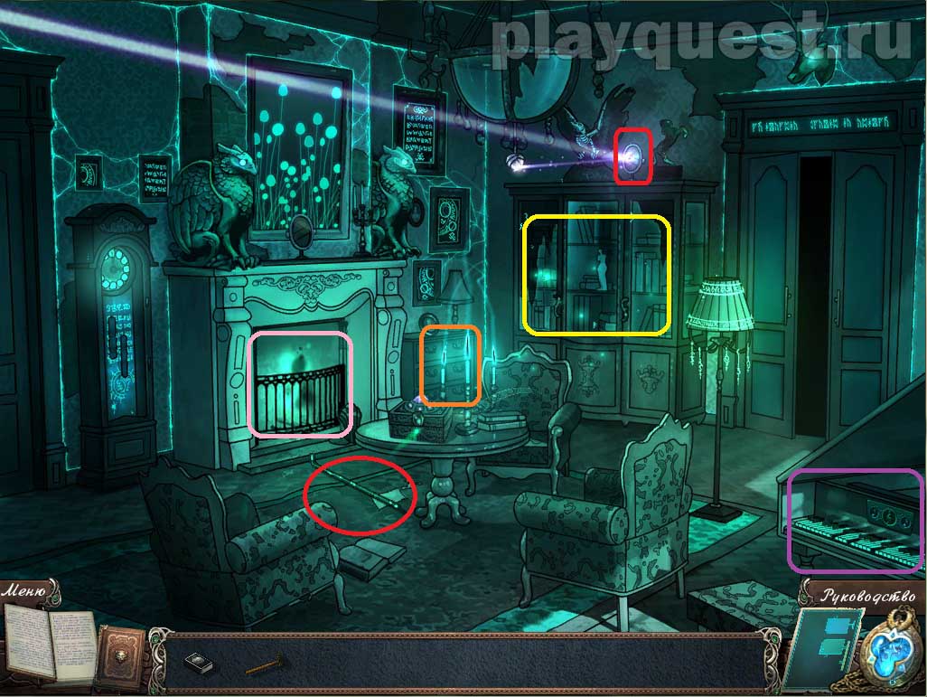 1. Крутим зеркальце на шкафу возле двери 2 раза - луч должен будет упасть на зеркало на камине.
