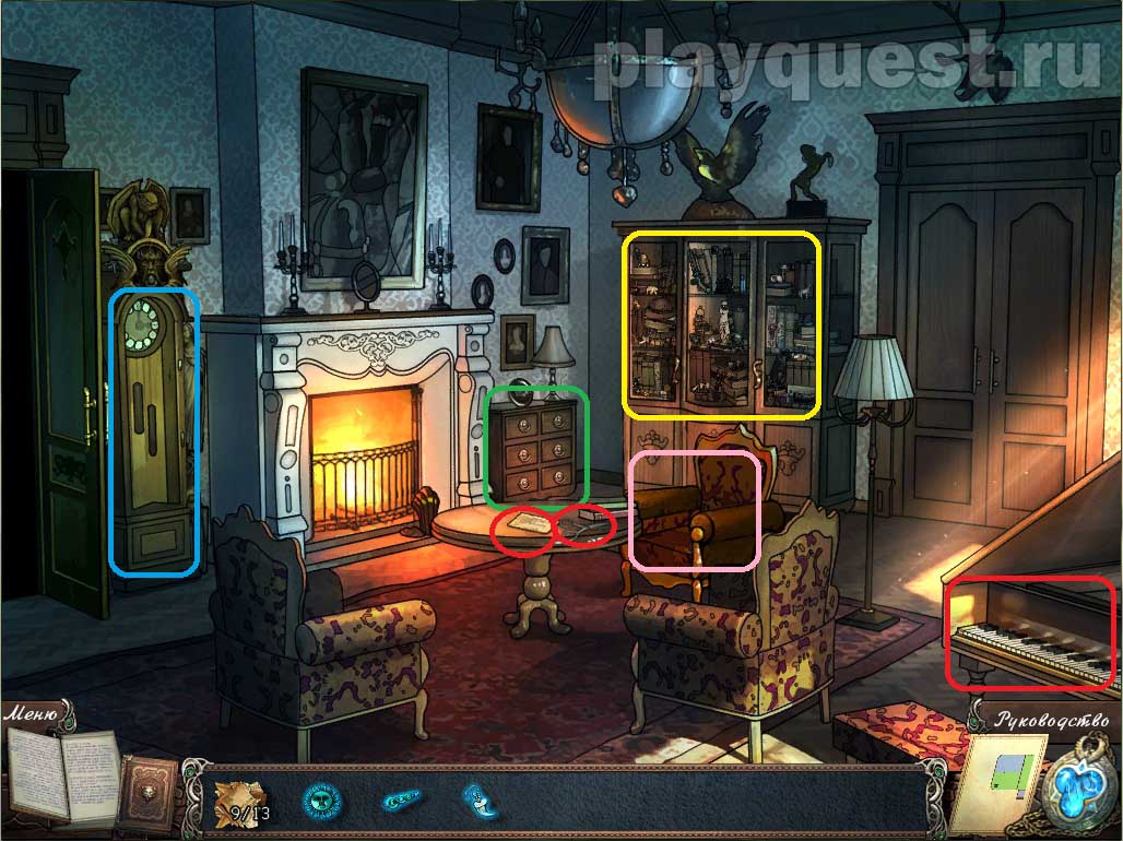 5. Изучаем комод справа от камина: это головоломка. Нужно открыть все ящики. Если пронумеровать ящики слева-направа сверху-вниз от 0 до 6, то последовательность действий такова: 5, 6, 2, 4, 3, 1. Забираем красный кристалл