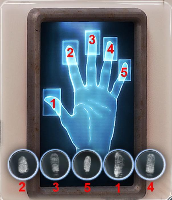 1. Изучаем замок на двери. Нам нужны отпечатки пальцев. Замечаем несколько на двери теперь осталось их собрать